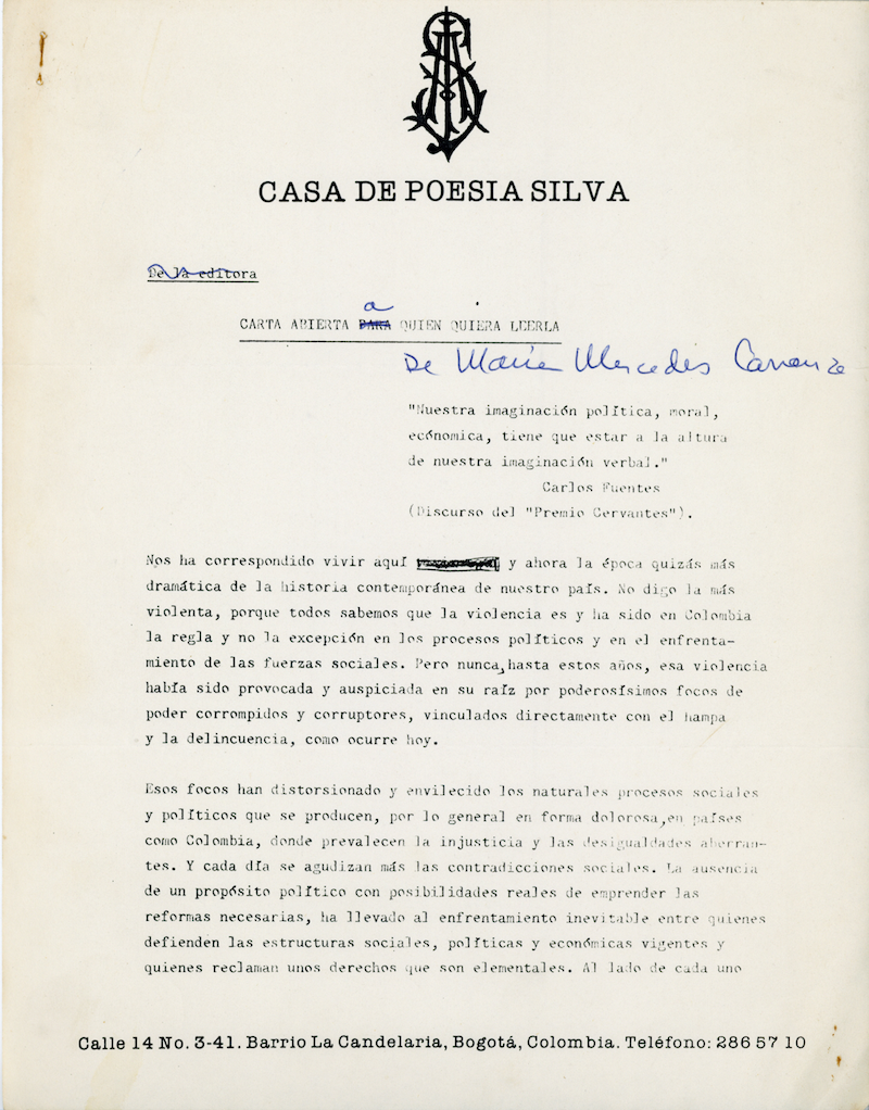 En esta carta, María Mercedes Carranza se dirige al profesor Julio Ortega, de la Brown University, para invitarlo a hacer una ponencia en un congreso del año siguiente, con motivo del centenario de la muerte de José Asunción Silva.
