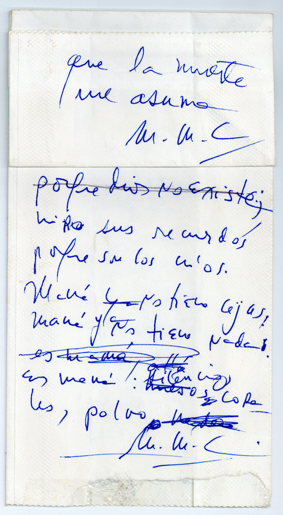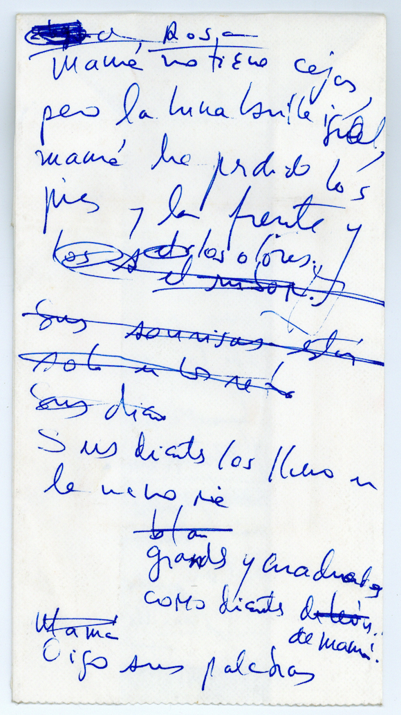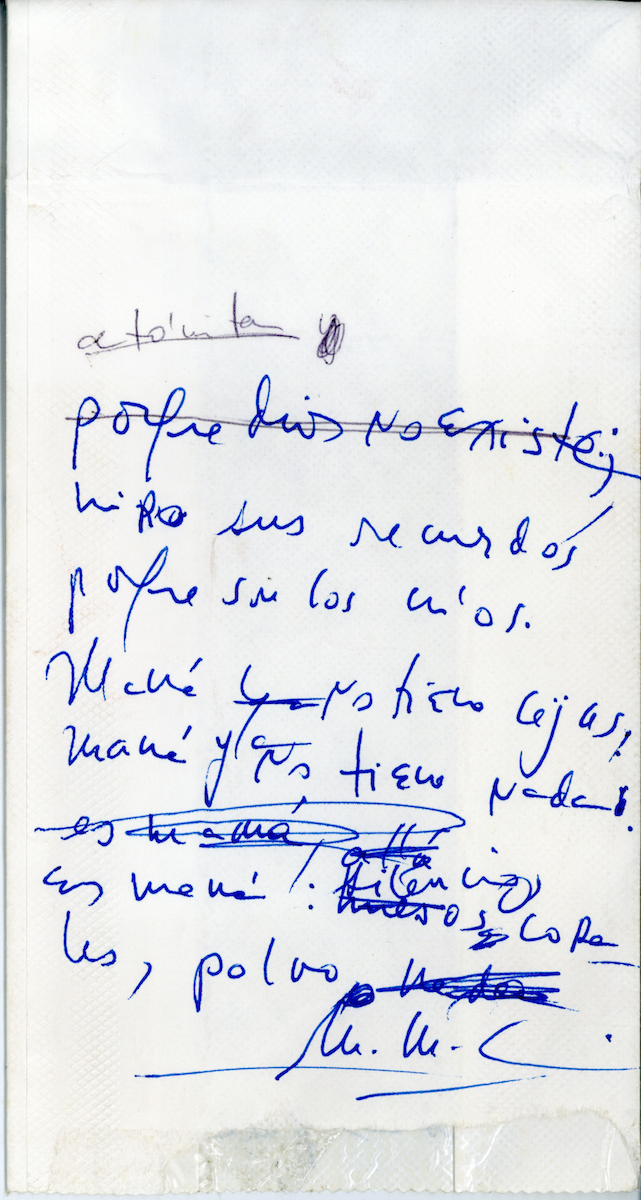Texto escrito sobre una bolsa de papel de color blanca. Es una bolsa de avión plastificada por dentro. El poema está escrito a mano con estilógrafo de tinta azul. Tiene varias enmiendas manuscritas y bajo el pliegue de la bolsa hay una anotación en tinta negra.