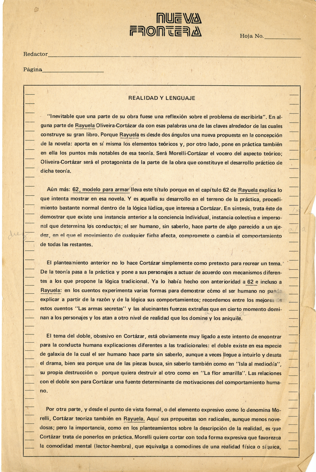Ensayo corto que demuestra cómo Julio Cortázar desarrolla, implícitamente en algunas de sus obras, una teoría literaria sobre el papel del lenguaje en la representación de la realidad.