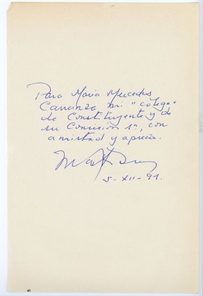 Dedicatoria del autor para Maria Mercedes, manuscrita en tinta negra en la cara de la anteportada.