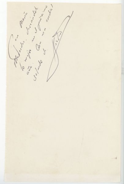La cara tiene dactilografiado en el borde inferior: "UNIVERSIDAD NACIONAL", en tinta negra, acompañado de varias anotaciones manuscritas: en la parte superior el nombre "Melibea", en tinta morada; abajo anotaciones en lápiz; y debajo la dedicatoria en tinta negra a Maria Mercedes de alguien que firma Giorgio. Debajo, la fecha.