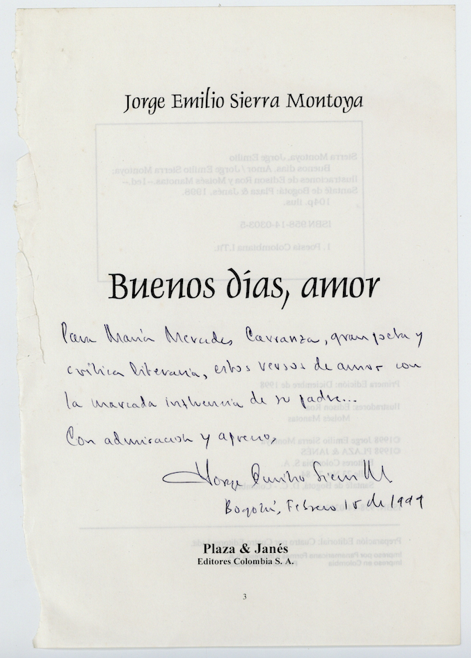 Tìtulo: Buenos días, amor Observaciones al título: Autor: Jorge Emilio Sierra Montoya Observaciones al autor: Dedicatoria de Jorge Emilio Sierra Montoya para María Mercedes Carranza Fecha: 1998 Observaciones a la fecha:La portada está marcada con la fecha 15 de febrero de 1999 Nº de folios: 1 Largo (cm): 24 Ancho (cm): 16.4 Técnica:Dactilorafiado en tinta negra con anotaciones en tinta negra Ficha bibliográfica: Sierra Montoya, Jorge Emilio. Buenos días, amor. Santafé de Bogotá: Plaza & Janés, 1998.