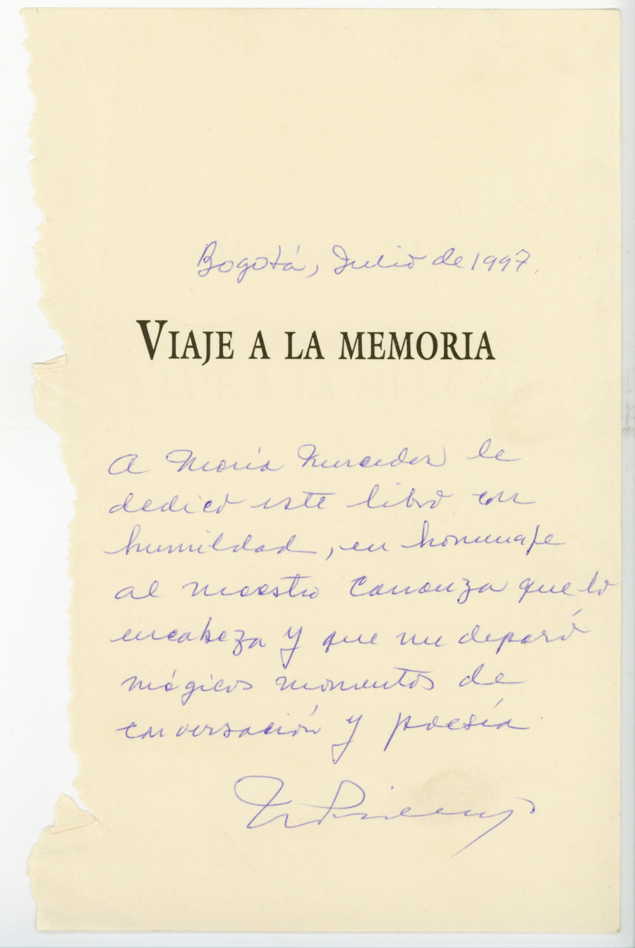 Título: Viaje a la memoria Observaciones al título: -- Autor del libro: Margarita Vidal Autor de la dedicatoria: Desconocido Observaciones al autor: Dedicatoria para María Mercedes Fecha: Julio de 1997 Observaciones a la Fecha: La anteportada está marcada con la fecha Número de Folios: 1 Largo: 21.9 cm Ancho: 14 cm Técnica: Dactilografiada en tinta negra con anotaciones en tinta azul Ficha Bibliográfica: Vidal, Margarita. Viaje a la memoria. Santafé de Bogotá: Planeta Colombiana,1997.